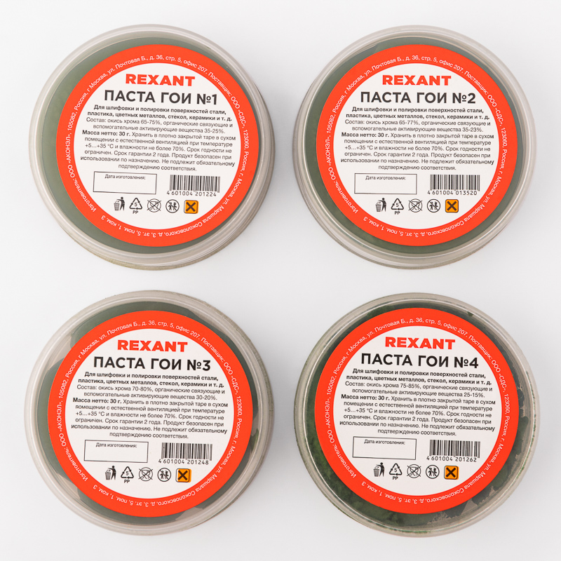 Паста ГОИ REXANT предназначена для шлифования и полирования стальных сплавов, цветных металлов, твердых пластмасс и полимеров, стекла (в том числе оптического), керамических материалов и изделий из них, тем самым устраняя мелкие царапины и создавая ровный блеск полируемой поверхности. Паста состоит из оксида хрома, который придает зеленый цвет, в виде абразивного порошка, жировых органических связующих, а также вспомогательных веществ, которые делают добавки более активными и интенсивными. При правильном использовании паста позволит добиться идеально ровного покрытия и вернет первозданный вид различным предметам.