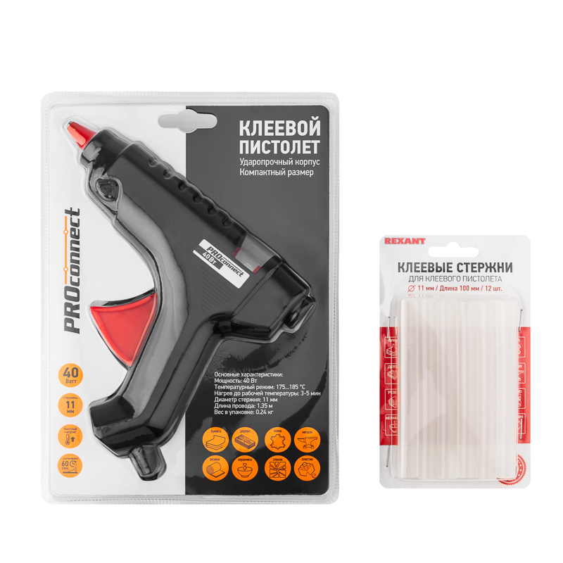 Клеевые стержни, которые входят в набор, изготовлены из ЭВА, и являются полностью экологичными и безопасными, комплекта из 12 стержней длиной 100 мм хватит для выполнения небольшого объема работ.