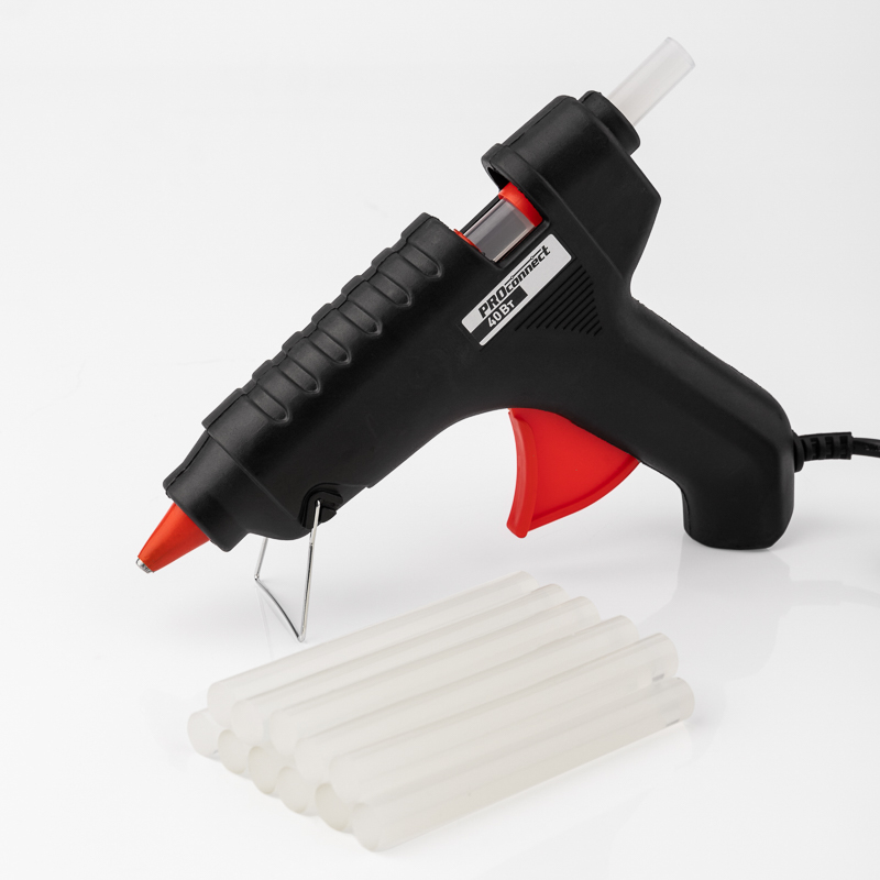 Набор состоит из клеевого пистолета и клеевых стержней. Клеевой пистолет предназначен склеивания поверхностей различных материалов, герметизации стыков и швов, фиксации проводов с помощью расплавленной клеевой массы. Используется в декорировании, в изготовлении поделок и моделировании; будет полезен как на производстве, так и в быту.