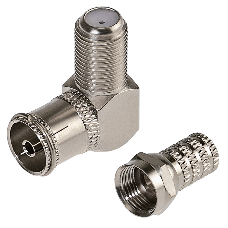 Набор антенных разъемов №4 предназначен для оконцевания кабелей. В наборе 1 угловой переходник (гнездо F – гнездо TV) и 1 F-разъем RG-6.