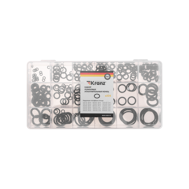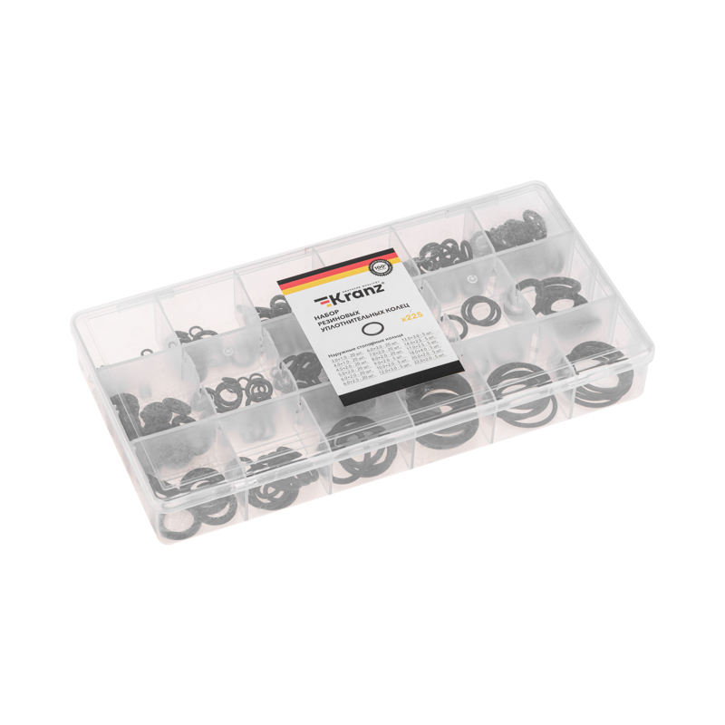 Набор состоит из 225 уплотнительных колец, которых хватит для выполнения множества задач. Поставляется в пластиковом органайзере, который помогает не только удобно хранить изделия, но и быстро находить крепеж нужного размера. Органайзер может в дальнейшем использоваться для хранения других крепежных элементов.