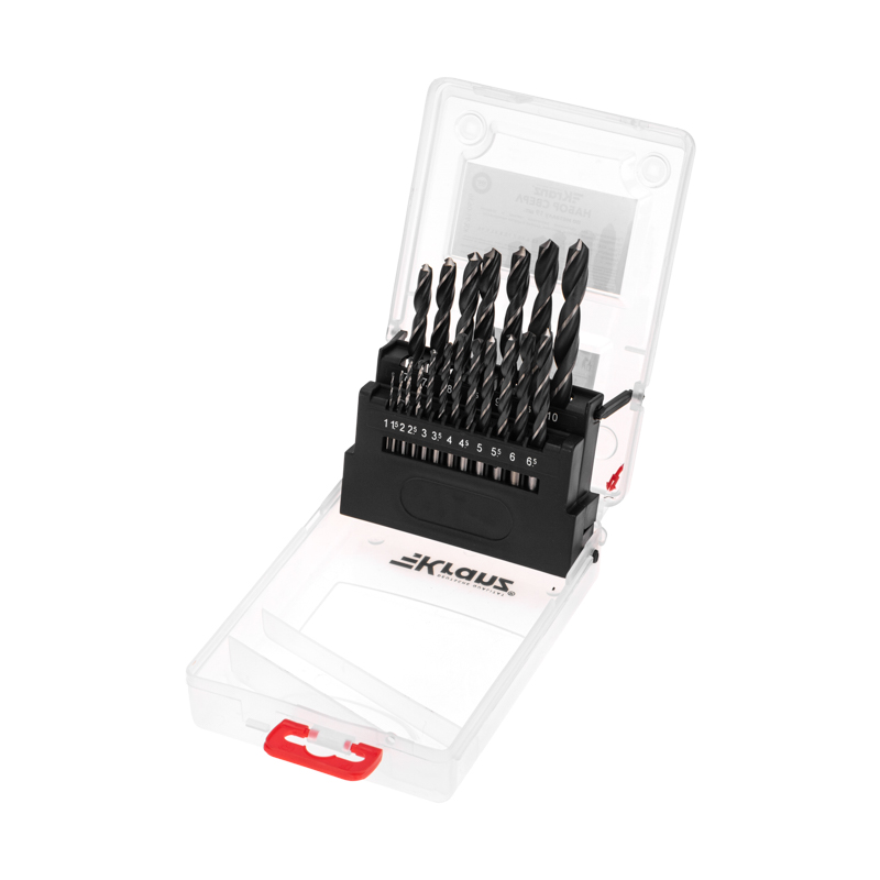 В состав набора входит 19 сверл, предназначенных для сверления отверстий в таких материалах, как сталь, дерево и пластик.
