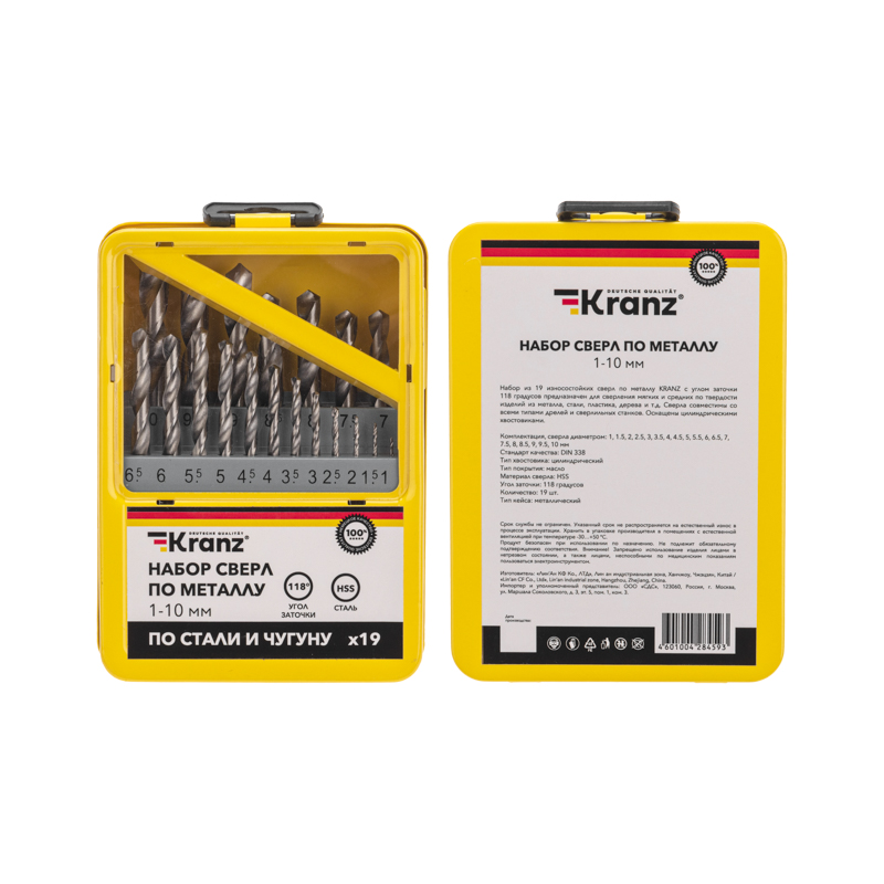 Набор из 19 износостойких сверл по металлу KRANZ с углом заточки 118 градусов предназначен для сверления мягких и средних по твердости изделий из металла, стали, пластика, дерева и т.д. Сверла совместимы со всеми типами дрелей и сверлильных станков. Оснащены цилиндрическими хвостовиками.