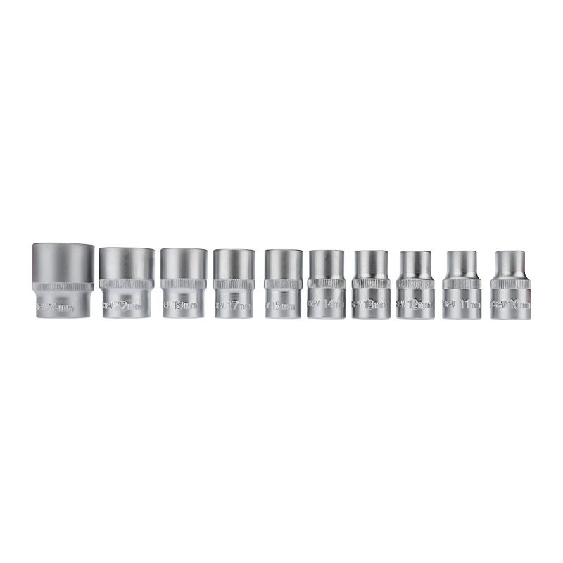 В наборе 10 съемных торцевых головок: 10, 11, 12, 13, 14, 15, 17, 19, 22 и 24 мм, которые имеют 6-гранный зев и посадочное место для присоединительного квадрата 1/2”.