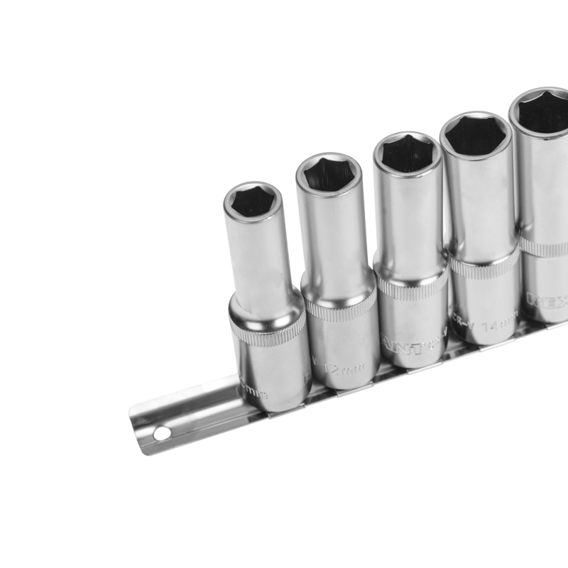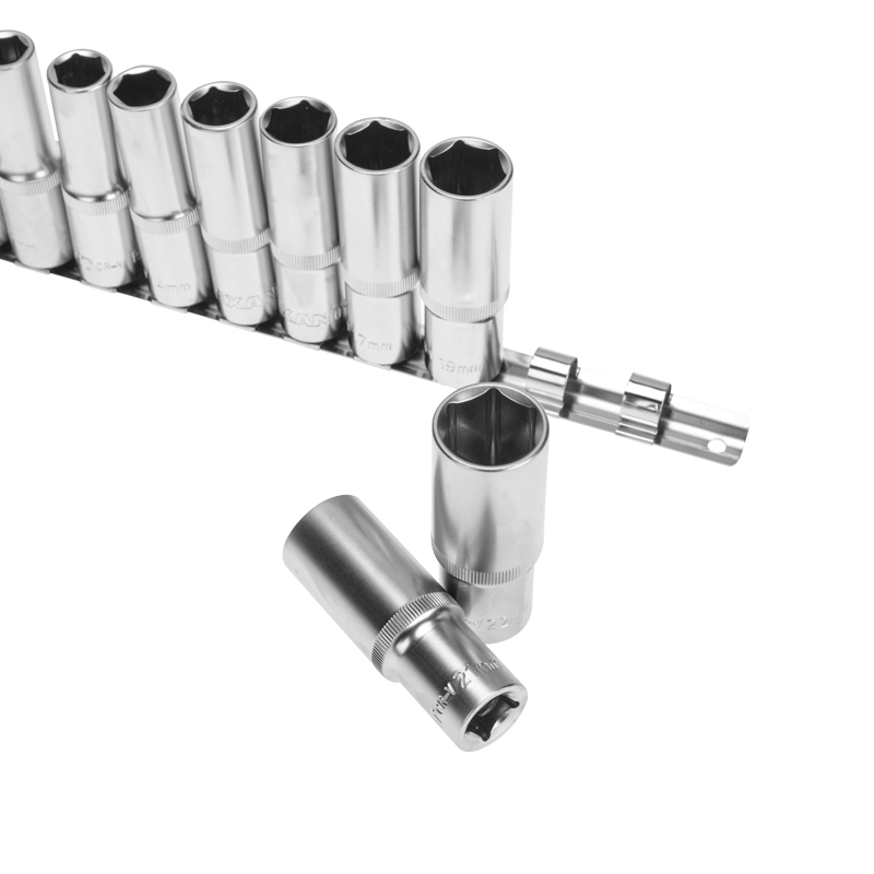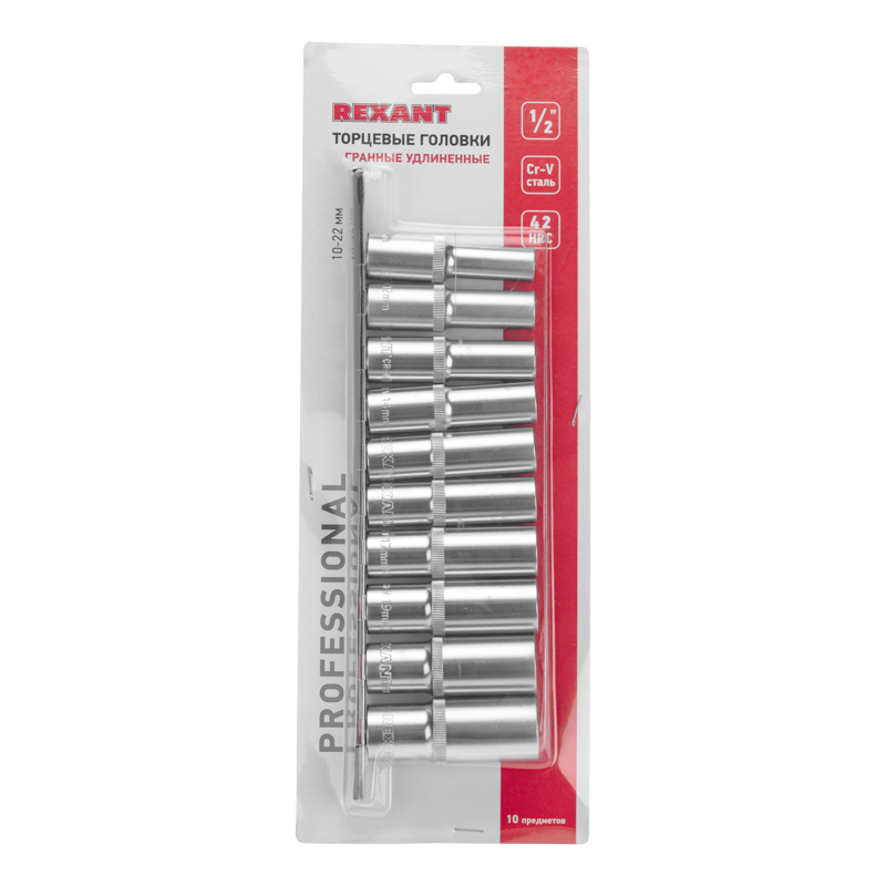 В набор входят 6-гранные удлиненные торцевые головки на планке под квадрат 1/2" следующих размеров: 10, 12, 13, 14, 15, 16, 17, 19, 21 и 22 мм.
