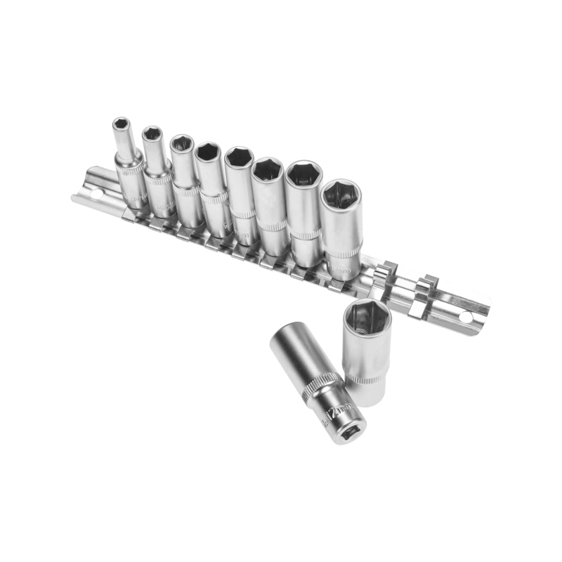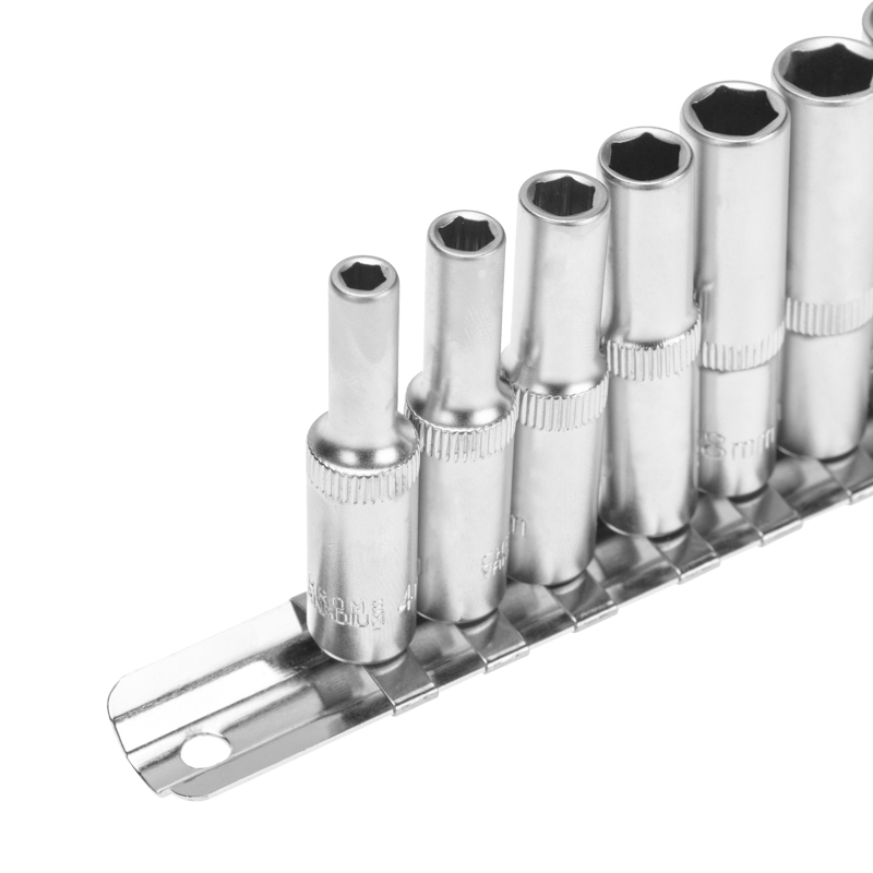 В набор входят 6-гранные удлиненные торцевые головки на планке под квадрат 1/4" следующих размеров: 4, 5, 6, 7, 8, 9, 10, 11, 12 и 13 мм.