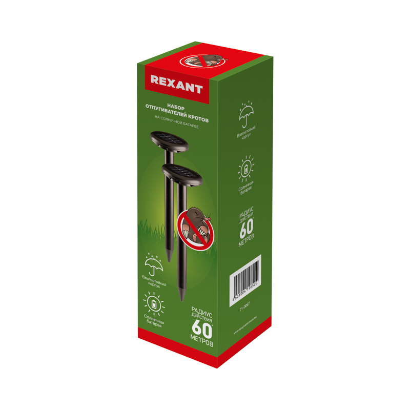 Состав набора: ультразвуковой отпугиватель кротов на солнечной батарее REXANT R30 (черный) - 2 шт.