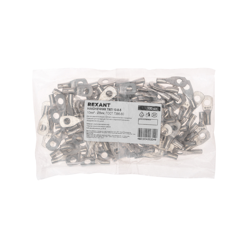Наконечник ТМЛ 10-8-5 (10мм² - Ø8мм) REXANT предназначен для оконцевания проводов и кабелей с медными и алюминиевыми жилами посредством опрессовки для последующего болтового соединения проводника с оборудованием или шиной.