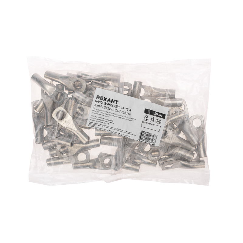 Наконечник ТМЛ 35–12–9 (35мм² - Ø12мм) REXANT предназначен для оконцевания проводов и кабелей с медными и алюминиевыми жилами посредством опрессовки для последующего болтового соединения проводника с оборудованием или шиной.