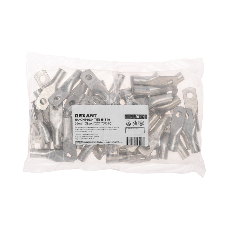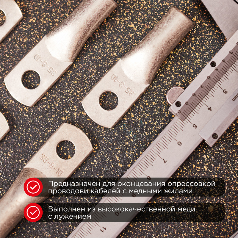 Наконечник ТМЛ 35–8–10 (35мм² - Ø8мм) REXANT предназначен для оконцевания проводов и кабелей с медными и алюминиевыми жилами посредством опрессовки для последующего болтового соединения проводника с оборудованием или шиной.
