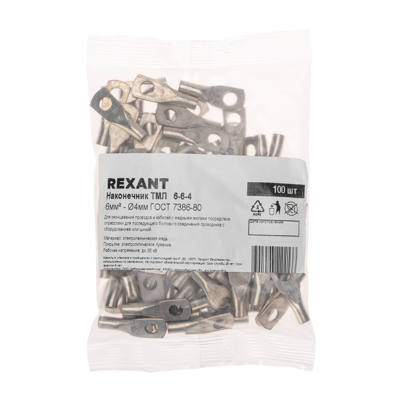 Наконечник ТМЛ 6-6-4 (6мм² - Ø6мм) REXANT предназначен для оконцевания проводов и кабелей с медными и алюминиевыми жилами посредством опрессовки для последующего болтового соединения проводника с оборудованием или шиной.