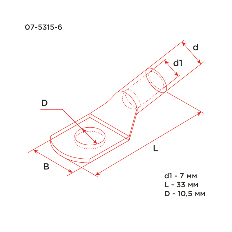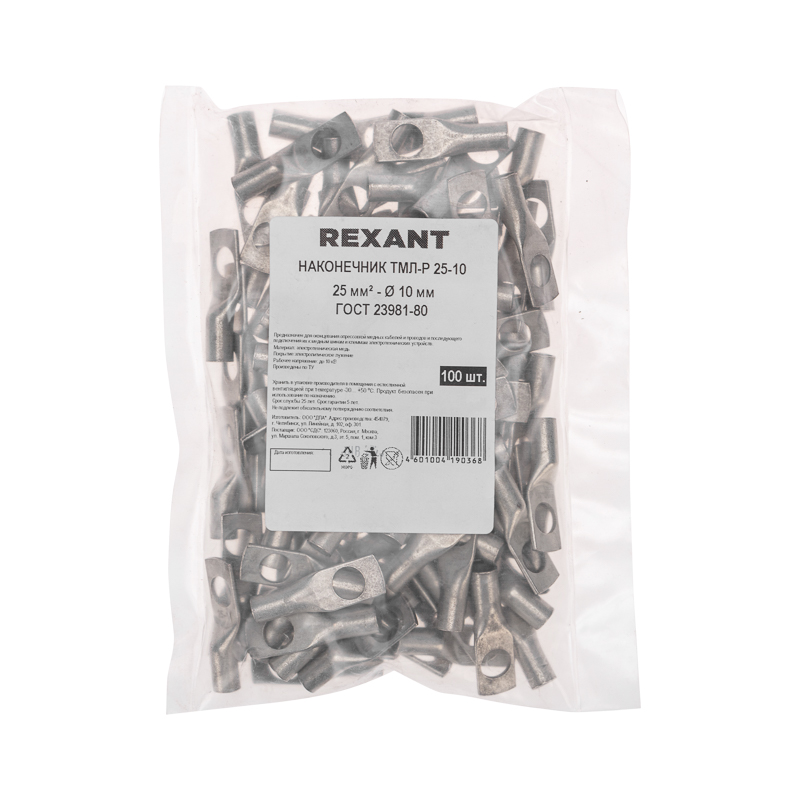 Наконечник ТМЛ-Р 25–10 (25мм² - Ø10мм) REXANT предназначен для оконцевания проводов и кабелей с медными и алюминиевыми жилами посредством опрессовки для последующего болтового соединения проводника с оборудованием или шиной.