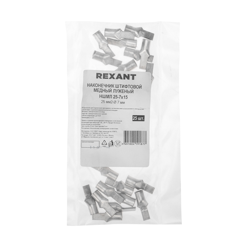 Наконечник штифтовой НШМЛ 25-7х15 (25 мм² - Ø 7 мм) REXANT используется для подключения проводников к автоматическим выключателям и к электрическим устройствам с зауженной шириной контактной площадки.