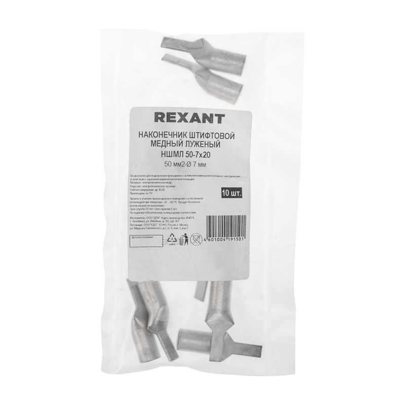 Наконечник штифтовой НШМЛ 50-7х20 (50 мм² - Ø 7 мм) REXANT используется для подключения проводников к автоматическим выключателям и к электрическим устройствам с зауженной шириной контактной площадки.