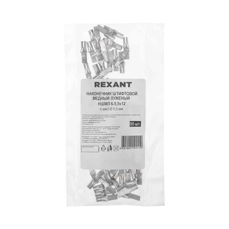 Наконечник штифтовой НШМЛ 6-5,5х12 (6 мм² - Ø 5,5 мм) REXANT используется для подключения проводников к автоматическим выключателям и к электрическим устройствам с зауженной шириной контактной площадки.