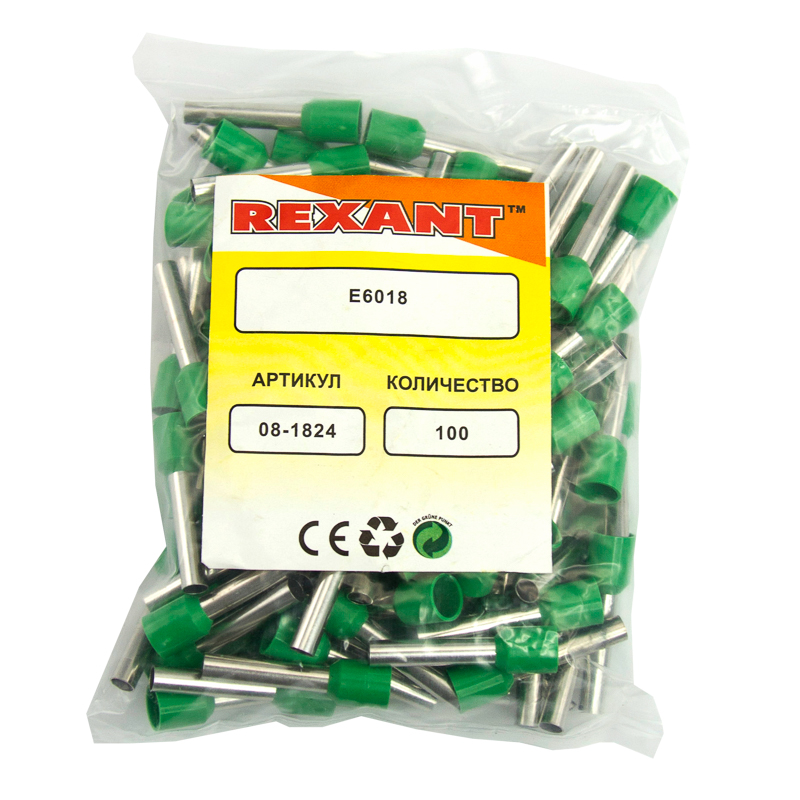 Наконечник штыревой втулочный изолированный F-18 мм 6 мм² (НШВи 6.0-18) зеленый REXANT