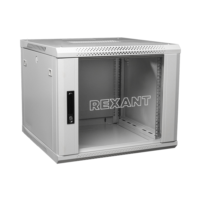 Настенный шкаф 19" 9U 600×600×501 (ШxГxВ), дверь стекло, металлическая задняя стенка, боковые съемные стенки, RAL 7035 REXANT