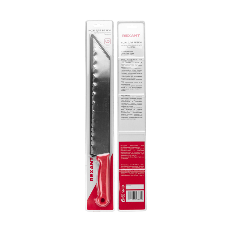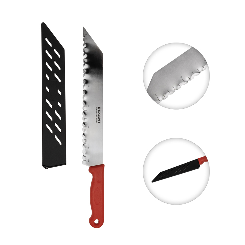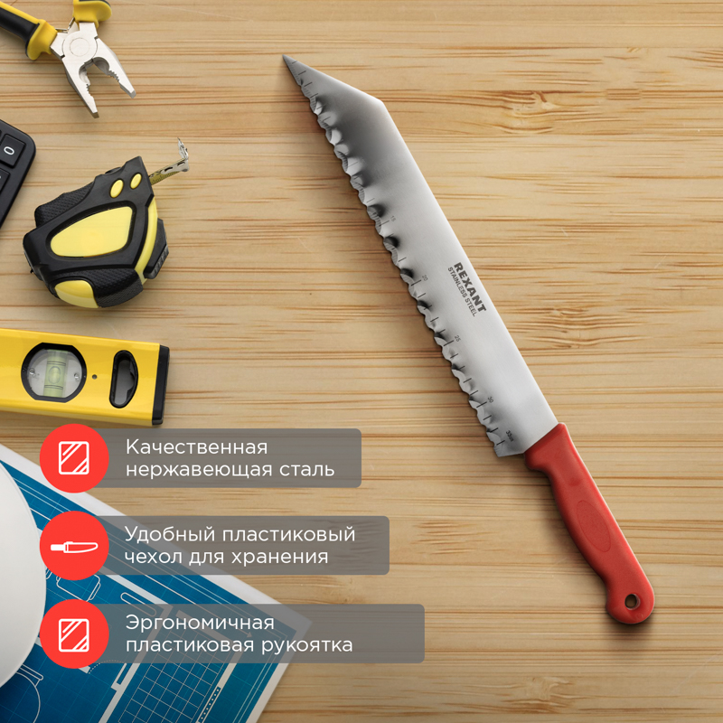 Нож REXANT предназначен для резки теплоизоляционных панелей, изготовленных из различных материалов, таких как: пенополистирол, минеральная вата, древесное волокно.