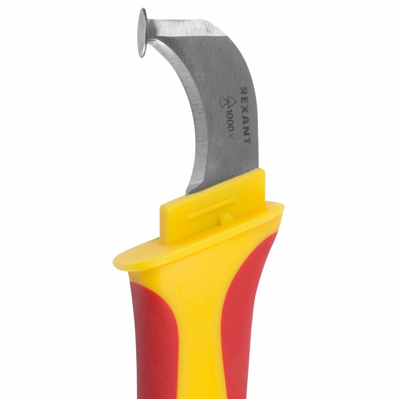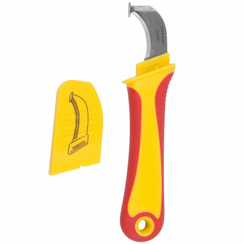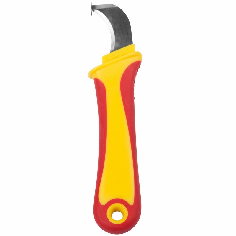 Усиленное лезвие со прецизионной двухсторонней заточкой подходит для работы с толстыми материалами, изготовлено из нержавеющей стали, благодаря чему защищено от коррозии и имеет продолжительный срок эксплуатации. Кончик ножа оснащен "пяткой" - ограничительной пластиной - для качественного снятия оболочки без риска повредить жильную изоляцию. Изогнутая форма лезвия делает нож удобным для работы в труднодоступных местах. Мощная противоскользящая двухкомпонентная рукоятка изготовлена из мягкого пластика и гарантирует комфорт и безопасность во время работы. Для удобного хранения и транспортировки ножа предусмотрены пластиковые ножны.
