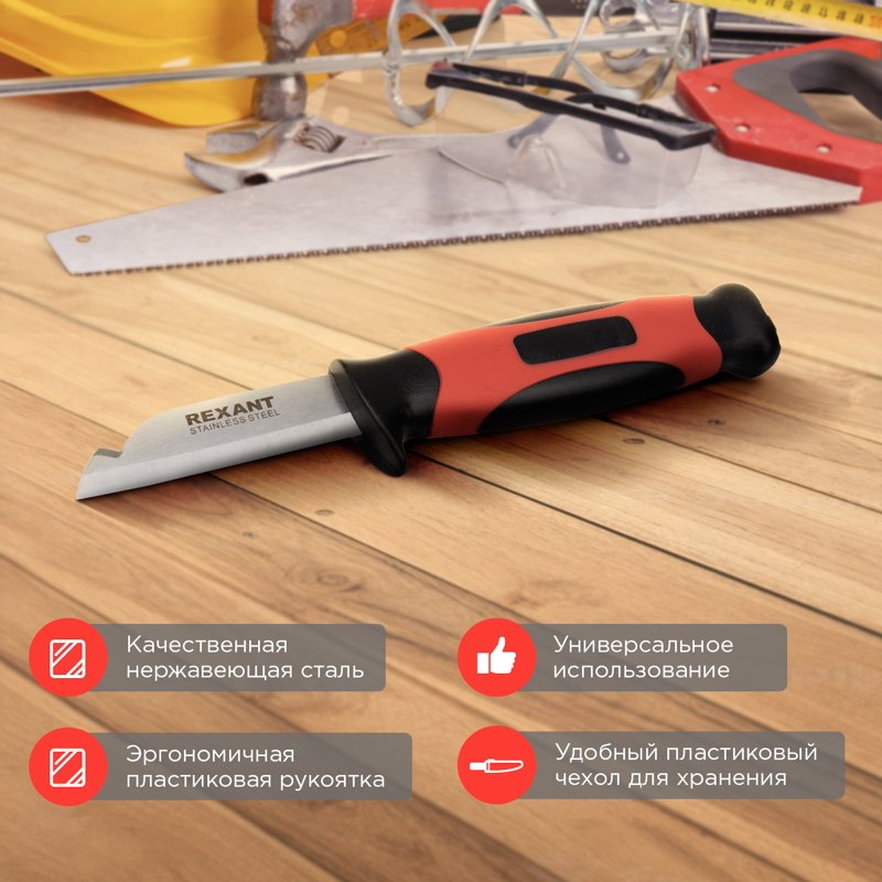 Универсальный нож монтажника REXANT предназначен для проведения отделочных, ремонтно-строительных работ, пригоден в походах, на рыбалке, во время туризма. Инструмент изготовлен из прочных и надежных материалов, благодаря чему имеет повышенный рабочий ресурс.