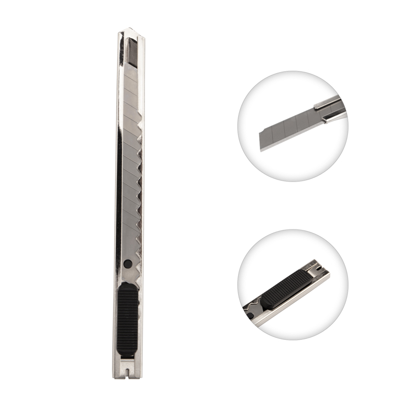 Корпус ножа выполнен из металла и оснащен клипсой, благодаря которой инструмент можно фиксировать на одежде. Сегментированное лезвие шириной 9 мм изготовлено из высококачественной инструментальной стали. Когда крайний сегмент затупляется, его можно отломить и продолжить использовать инструмент.