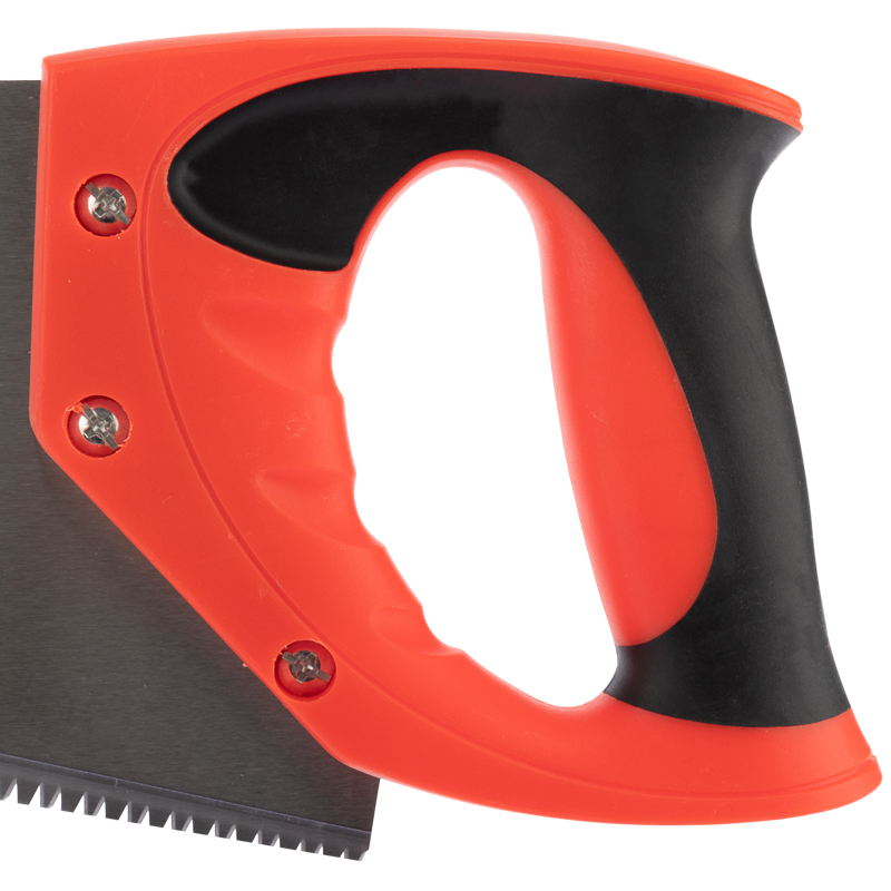 Двухкомпонентная рукоятка изготовлена из ударопрочного обрезиненного пластика и прикреплена к полотну тремя винтами.