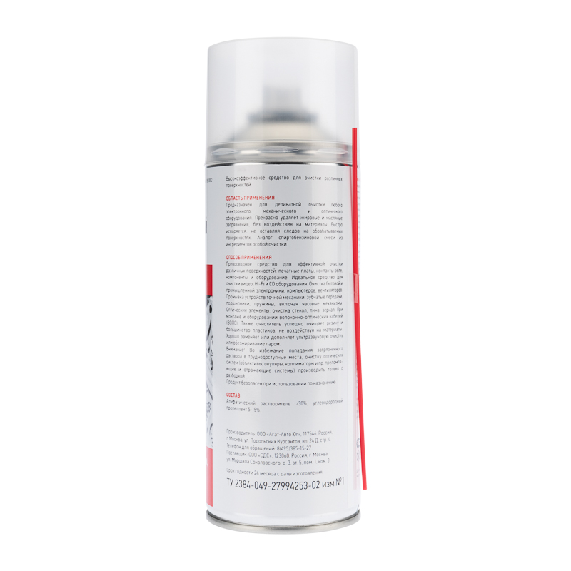 Применение: превосходное средство для эффективной очистки различных поверхностей: печатные платы, контакты реле, компоненты и оборудование. Идеальное средство для очистки видео, Hi-Fi и CD оборудования. Очистка бытовой и промышленной электроники, компьютеров, вентиляторов. Промывка устройств точной механики: зубчатые передачи, подшипники, пружины, включая часовые механизмы. Оптическое оборудование: очистка стекол, линз, объективов. При монтаже и обслуживании волоконно-оптических кабелей (ВОЛС). Также очиститель успешно очищает резину и большинство пластиков, не воздействуя на эти материалы. Хорошо заменяет или дополняет ультразвуковую очистку или обезжиривание паром.