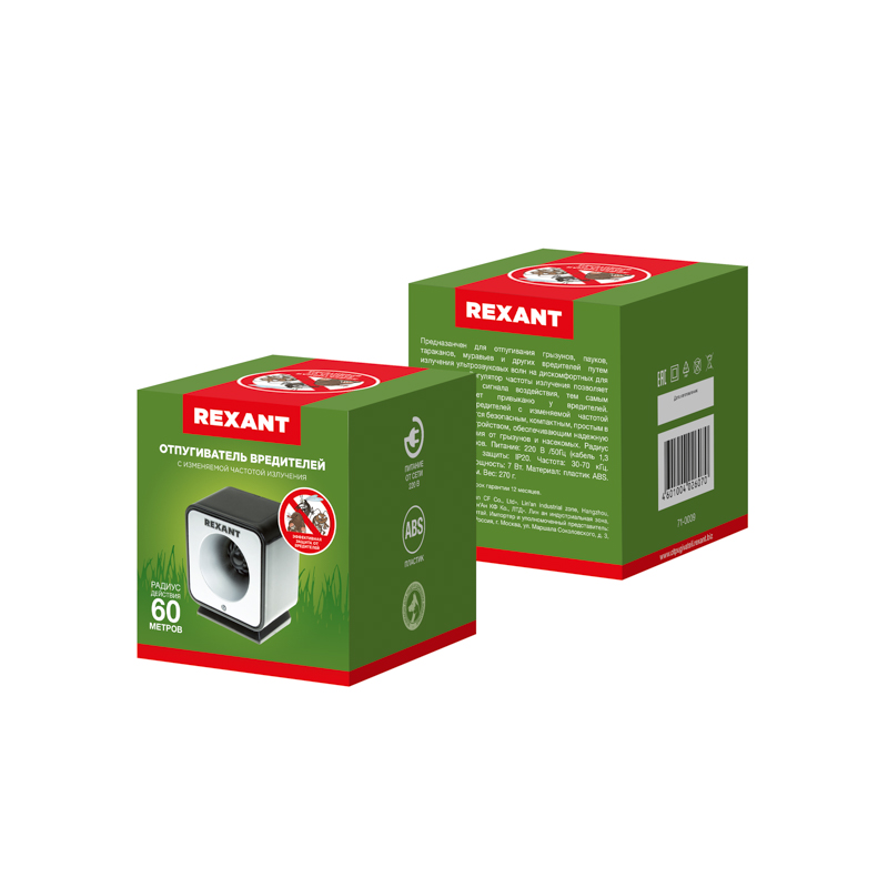 Отпугиватель вредителей REXANT с изменяемой частотой излучения предназначен для отпугивания грызунов, пауков, тараканов, муравьев, моли и других вредителей путем излучения ультразвуковых волн на дискомфортных для них частотах.