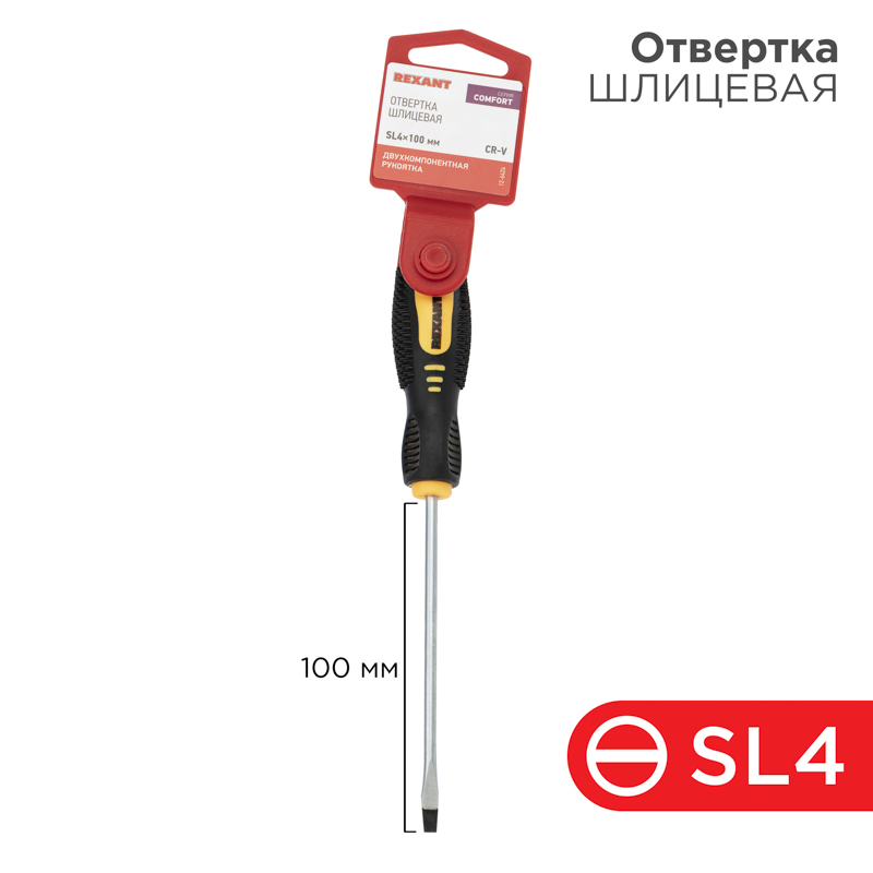 Отвертка шлицевая SL4х100мм, двухкомпонентная рукоятка REXANT