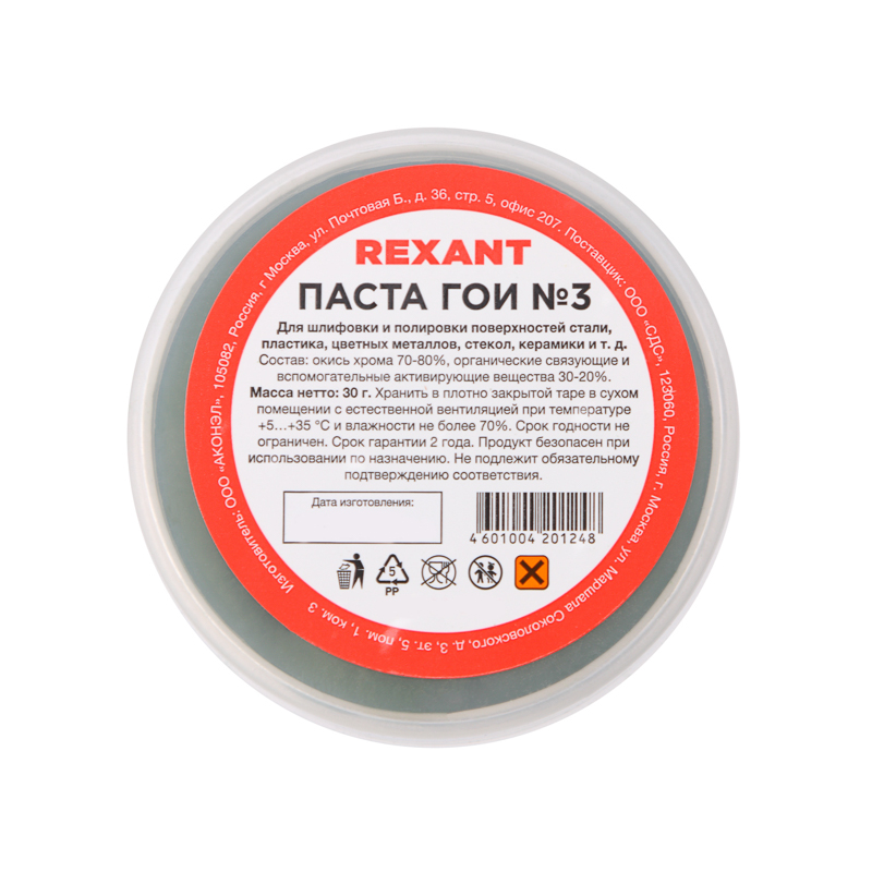 Паста ГОИ № 3 (аббревиатура от Государственный Оптический Институт) – это абразивный материал, применяемый для шлифовки и полировки поверхностей стали, пластика, цветных металлов, стекол, керамики и т. д.