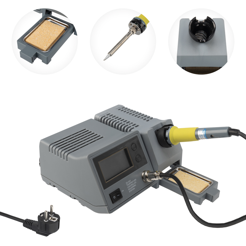 Температура нагрева жала варьируется в диапазоне от 150 до 450 °С и регулируется с помощью потенциометра, который позволяет точно устанавливать и контролировать температуру паяльника. Текущая температура нагрева отображается на цифровом дисплее, расположенном на корпусе устройства. Станция имеет кнопочное управление. Прибор оснащен современной антистатической защитой.
