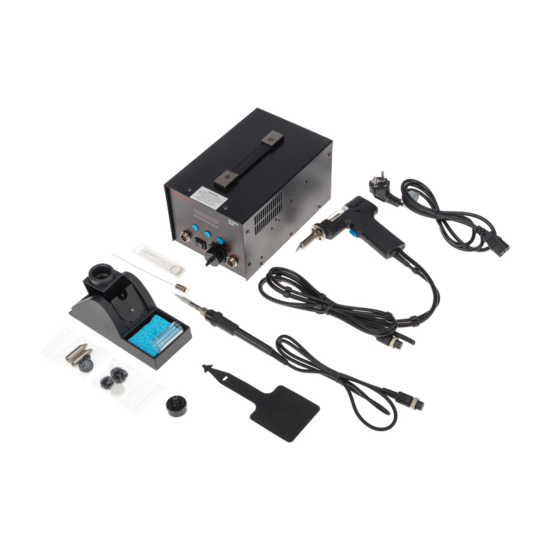 В комплектацию станции входят: основной блок, паяльник, демонтажный паяльник, держатель паяльника, губка для очистки жала паяльника (в ложементе)