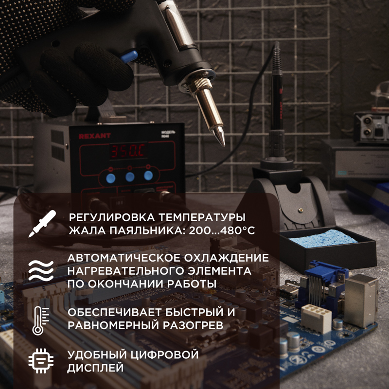 Микрокомпьютер для цифрового отображения данных и контроля температуры с точностью до 1 °C, большая мощность, быстрый разогрев. Все эти преимущества делают бессвинцовую распайку или пайку безопасной для таких чувствительных компонентов как SOIC, PLCC, QFP, BGA и т. д.