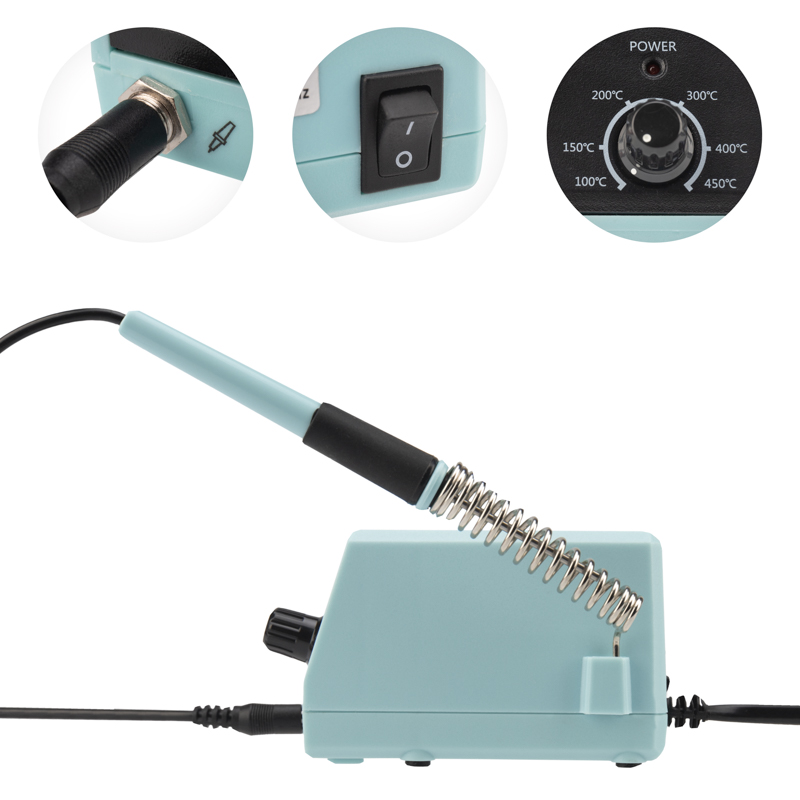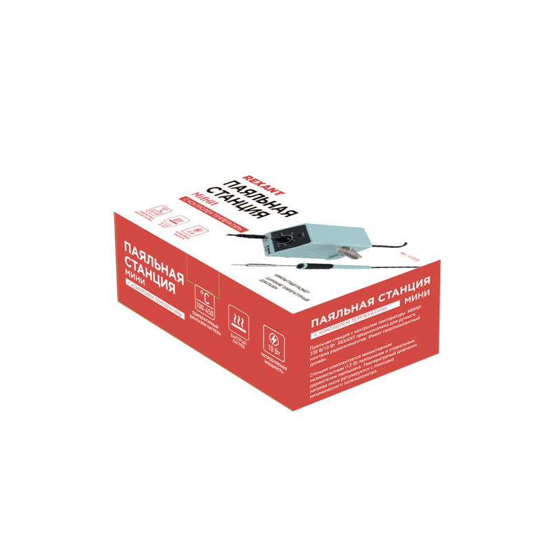Станция комплектуется миниатюрным низковольтным (12 В) паяльником и спиральным держателем паяльника.