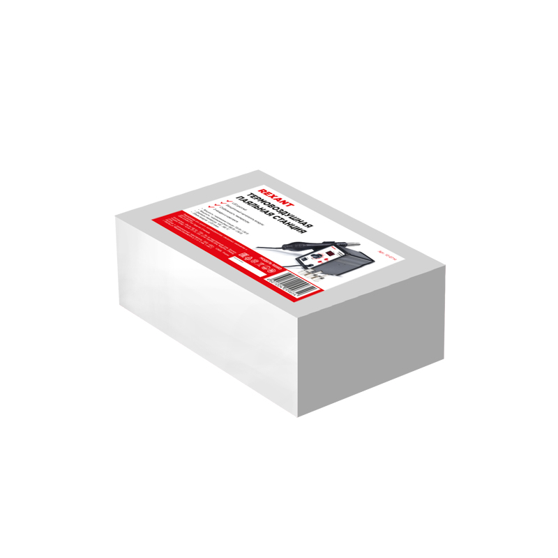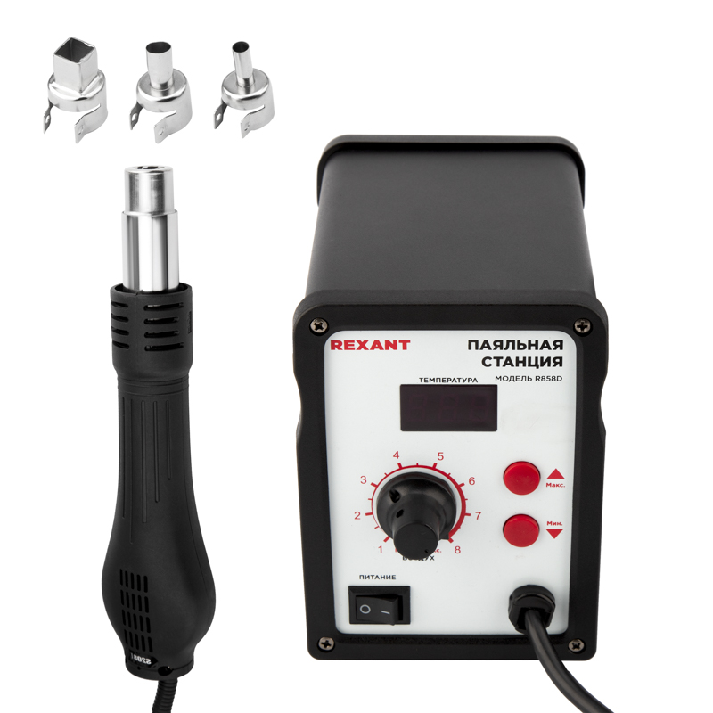 В комплектацию станции входят: основной блок, термофен, держатель термофена, 3 насадки разного размера.