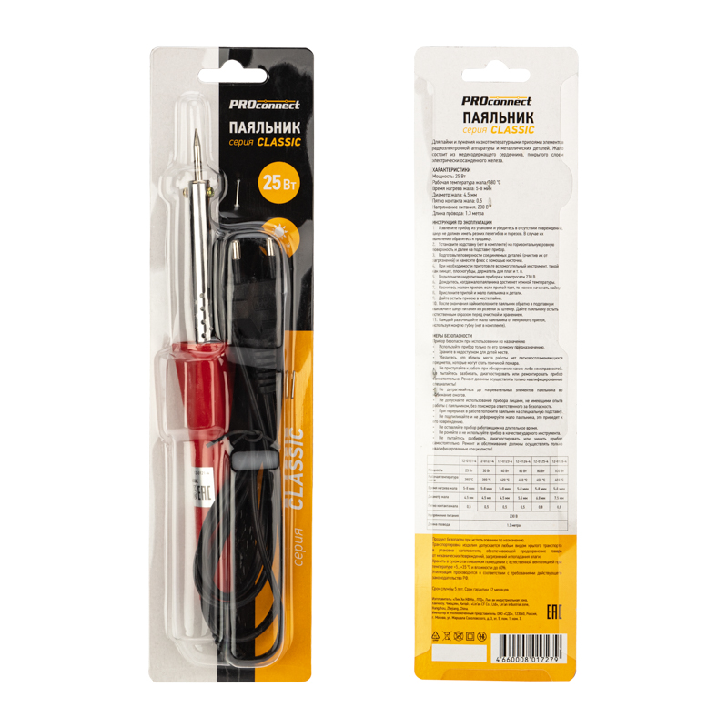 Паяльник серия Classic мощностью 25Вт PROconnect предназначен для ручного монтажа/демонтажа электронных компонентов и других мелких деталей. Подходит как для любительского, так и для профессионального использования. Долговечное жало паяльника состоит из медьсодержащего сердечника, покрытого слоем хрома. В случае необходимости его можно легко и быстро заменить (сменное жало в комплект не входит).