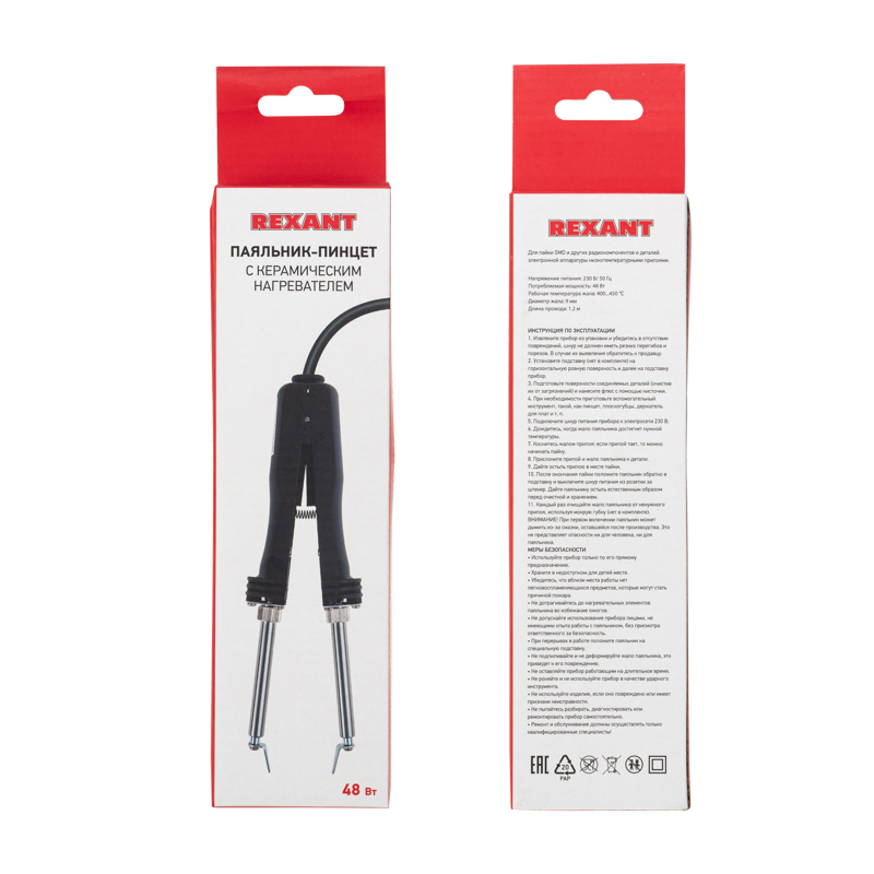 Паяльник-пинцет с керамическим нагревателем мощностью 48Вт REXANT предназначен для ручного монтажа/демонтажа электронных компонентов и других мелких и средних деталей. Подходит как для любительского, так и для профессионального использования. Конструкция состоит из двух паяльников, соединенных шарниром, между которыми установлена пружина. Керамический нагреватель обеспечит быстрый прогрев жала и длительный срок службы паяльника. Окончания жал имеют тонкую плоскую форму, благодаря чему подходят для демонтажа различных компонентов. Рабочая часть жала электрохимически покрыта слоем олова, что обеспечивает улучшенное облуживание.