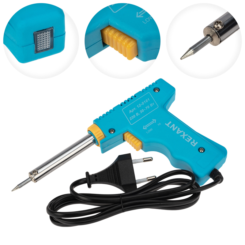 Конструктивные особенности: рукоятка в форме пистолета, возможность осуществлять пайку в двух режимах мощности (30Вт и 70Вт). Наличие 2-х режимов обеспечивает экономичное энергопотребление. Максимальная мощность и ускоренный разогрев активируются нажатием и удержанием кнопки, расположенной на рукоятке, что позволяет мастеру сначала установить жало инструмента в определенную точку пайки, а затем перевести паяльник в максимальный рабочий режим.