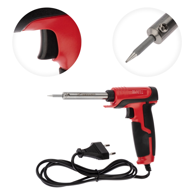 Конструктивные особенности: рукоятка в форме пистолета из термостойкого пластика с резиновыми вставками, два режима мощности 30Вт и 70Вт. Наличие 2-х режимов обеспечивает экономичное энергопотребление. Максимальная мощность и ускоренный разогрев активируются нажатием и удержанием кнопки, расположенной на рукоятке. Это позволяет сначала установить жало в определенную точку пайки, а затем перевести паяльник в максимальный рабочий режим.