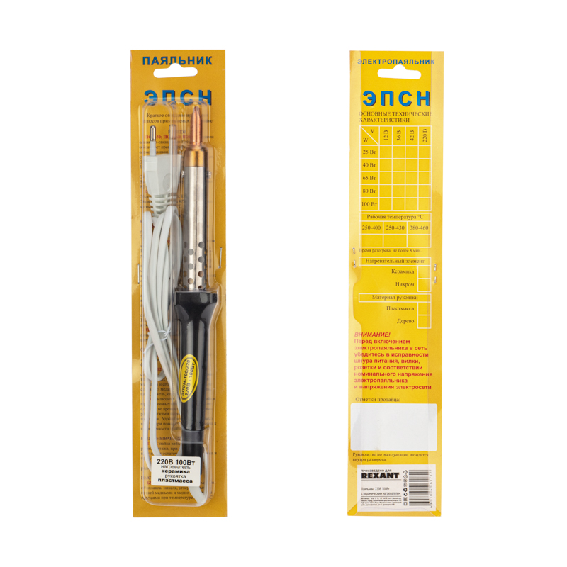 Паяльник с керамическим нагревателем серии ЭПСН мощностью 100Вт REXANT предназначен для ручного монтажа/демонтажа деталей среднего и крупного размера, а также для лужения. Подходит как для любительского, так и для профессионального использования. Медное жало выполнено в форме клина, в случае необходимости его можно легко и быстро заменить (сменное жало в комплект не входит).