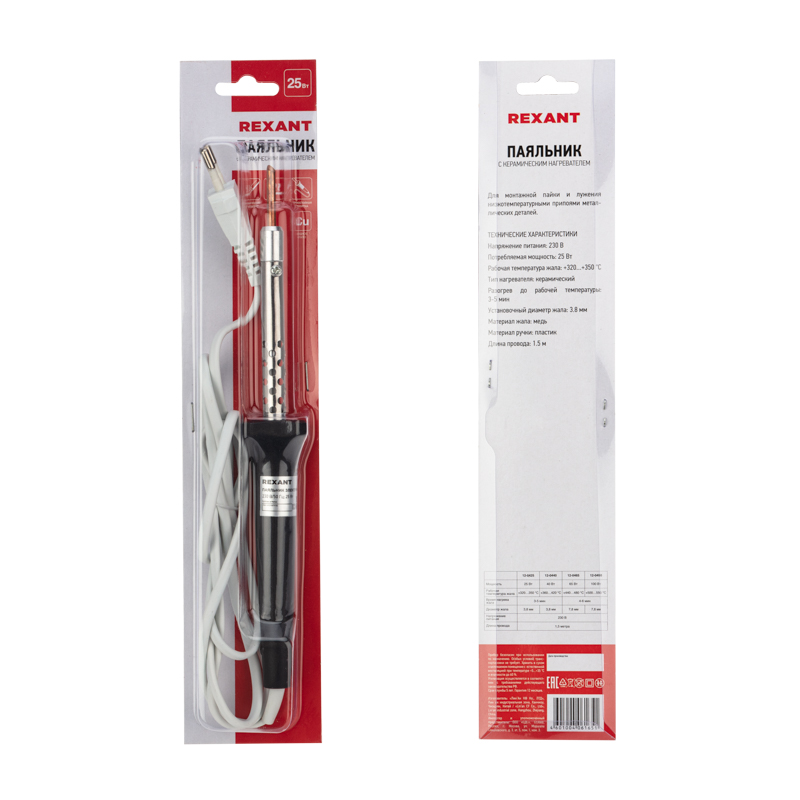 Паяльник с керамическим нагревателем серии ЭПСН мощностью 25Вт REXANT предназначен для ручного монтажа/демонтажа электронных компонентов и других мелких деталей. Подходит как для любительского, так и для профессионального использования. Медное жало выполнено в скошенной форме (45̊), в случае необходимости его можно легко и быстро заменить (сменное жало в комплект не входит).
