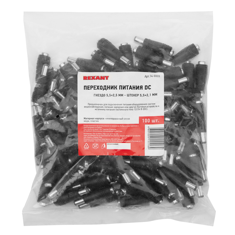 Переходник для адаптеров питания DC используется для подключения кабеля питания к оборудованию (видеокамерам, светодиодным лентам и т. п.) в случаях, когда типоразмеры подключаемых разъемов не совпадают. С одной стороны переходника находится гнездо питания 5,5х2,5 мм, с другой стороны — штекер питания 5,5х2,1 мм.