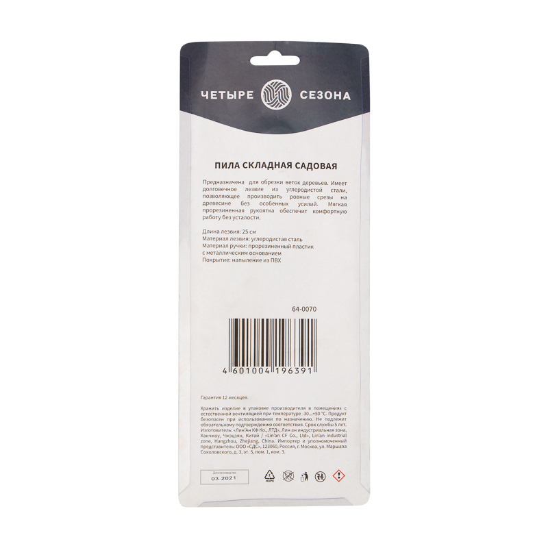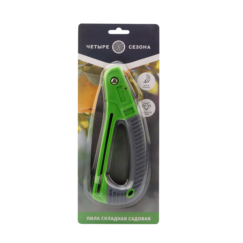 Компактная складная пила ЧЕТЫРЕ СЕЗОНА поможет быстро, эффективно и качественно подрезать деревья и кустарники вне зависимости от состояния древесины: она может быть как сухой, так и влажной - это никак не скажется на конечном результате работы. Лезвие длиной 18 см выполнено из прочной нержавеющей углеродистой стали и обладает резом в обе стороны. Пилящие ножи закалены при оптимальных температурах: это многократно увеличивает срок службы инструмента. Двухкомпонентная прорезиненная рукоятка из пластика предотвращает скольжение руки, обеспечивает удобный захват, делает работу более комфортной и удобной. Конструкция складной пилы позволяет хранить инструмент как в горизонтальном (на столе, полке), так и в подвешенном (на гвозде, крючке) положении. Для безопасности использования инструмент оснащен фиксатором положений: лезвие закрепляется как в раскрытом, так и в сложенном состоянии. Кулиса на рукоятке защищает руки от царапин и повреждений.