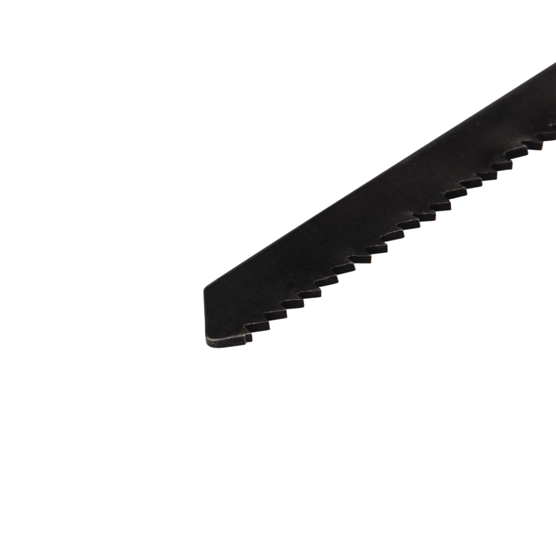 Полотно пилки выполнено из высокоуглеродистой стали, поэтому отличается прочностью и долговечностью. Режущая кромка состоит из зубьев с шагом 2,1 мм и рассчитана на получение чистого реза. Улучшенная закалка токами высокой частоты увеличивает твердость зубьев и обеспечивает высокий ресурс. Универсальный Т-образный хвостовик подходит для установки на большинство моделей электролобзиков.