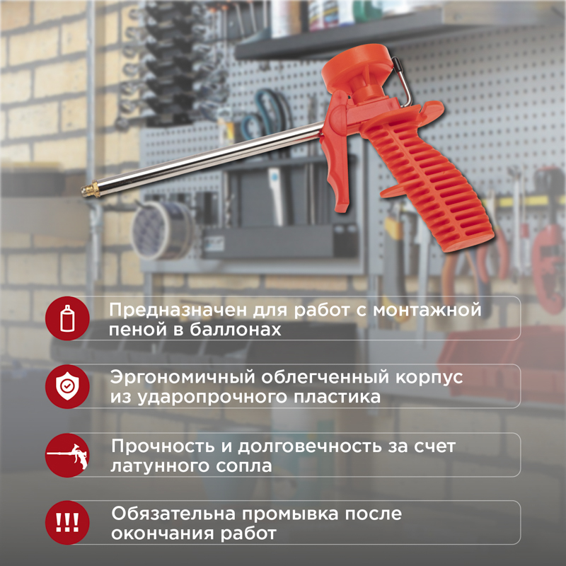 Пистолет REXANT предназначен для работ с монтажной пеной в баллонах, имеющих резьбовой соединитель. Используется для герметизации швов, трещин, стыков, проемов и пр.