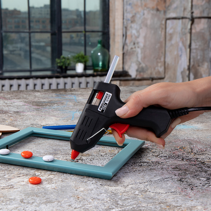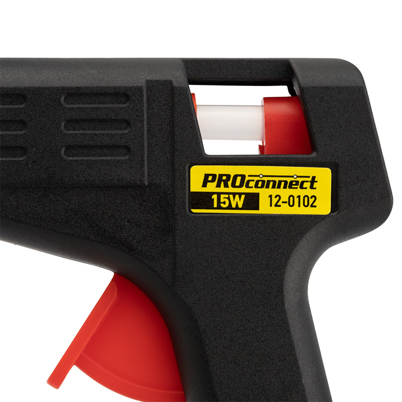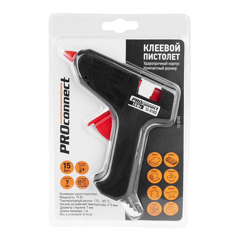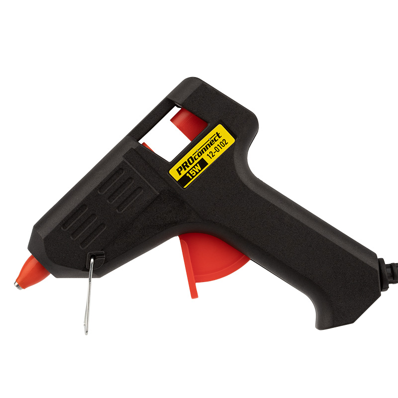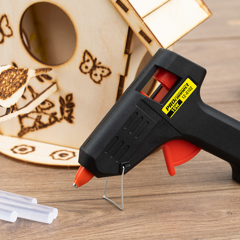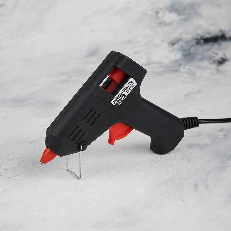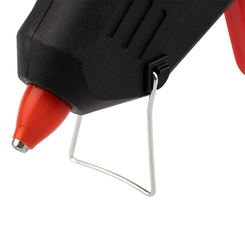Корпус пистолета изготовлен из ударопрочной пластмассы, поэтому инструмент служит дольше, а металлическая скоба позволяет устанавливать пистолет в режиме ожидания. Сопло пистолета защищено клапаном от произвольного вытекания клея и оснащено термостойким силиконовым протектором, минимизирующим риск ожогов при случайном контакте и защищающим рабочую зону от высокой температуры. Пистолет используется с клеевыми стрежнями диаметром 7 мм.