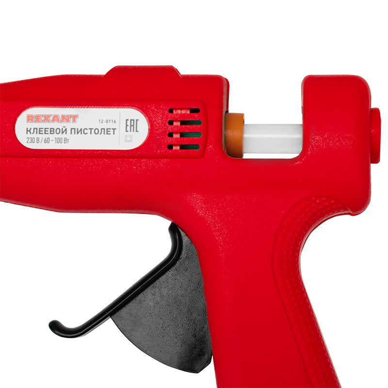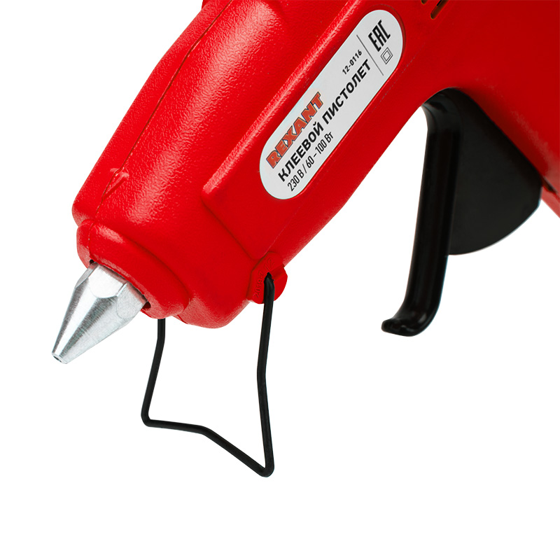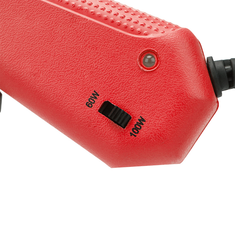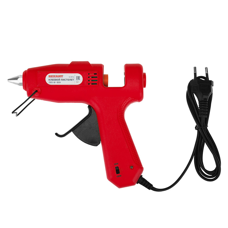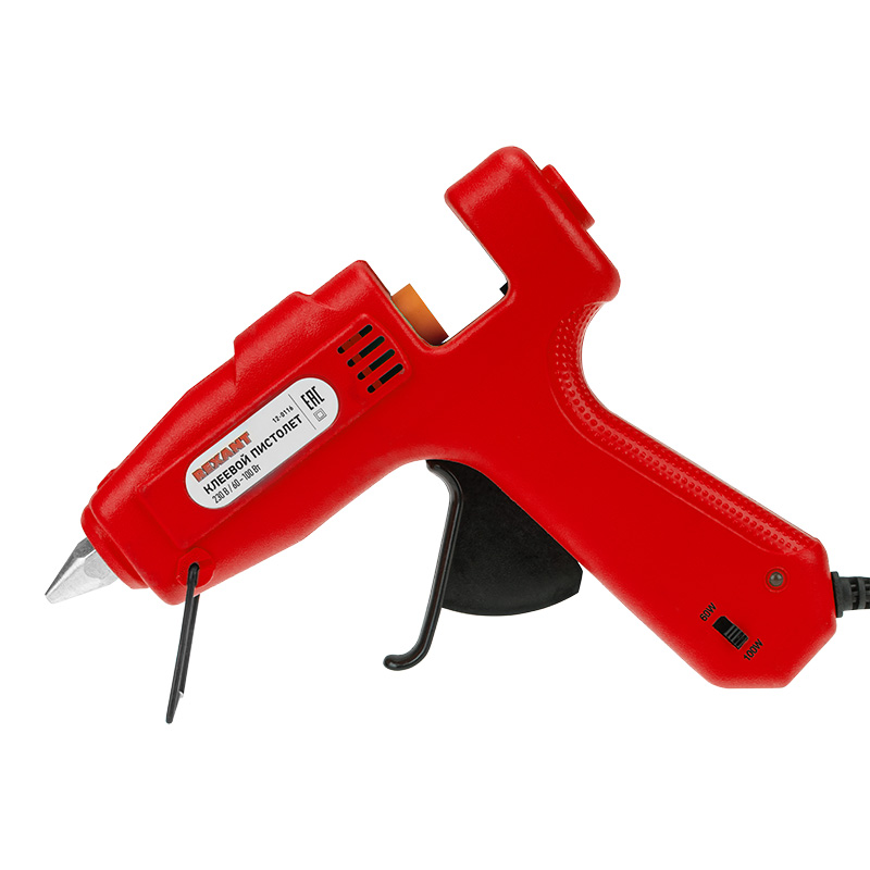 Корпус пистолета изготовлен из ударопрочной пластмассы, поэтому инструмент служит дольше, а металлическая скоба позволяет устанавливать пистолет в режиме ожидания. Сопло пистолета защищено клапаном от произвольного вытекания клея. На корпусе пистолета есть кнопка, с помощью которой можно выбрать минимальный режим нагрева 60 Вт или максимальный режим 100 Вт. Пистолет используется с клеевыми стрежнями диаметром 11 мм.
