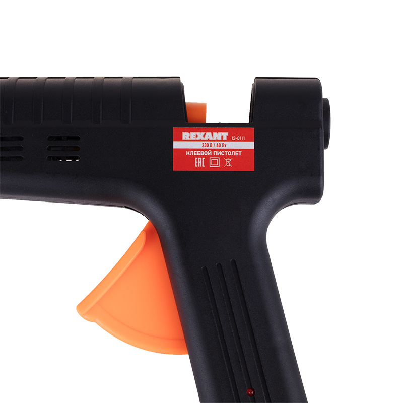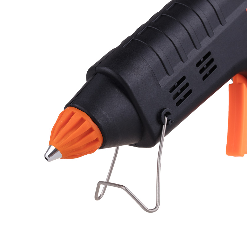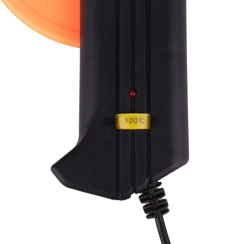 Корпус пистолета изготовлен из ударопрочной пластмассы, поэтому инструмент служит дольше, а металлическая скоба позволяет устанавливать пистолет в режиме ожидания. Сопло пистолета защищено клапаном от произвольного вытекания клея и оснащено термостойким силиконовым протектором, минимизирующим риск ожогов при случайном контакте и защищающим рабочую зону от высокой температуры. На корпусе пистолета есть регулятор температуры, который позволяет настраивать температуру плавления клеевого стрежня в диапазоне 120-240 градусов. Пистолет используется с клеевыми стрежнями диаметром 11 мм.