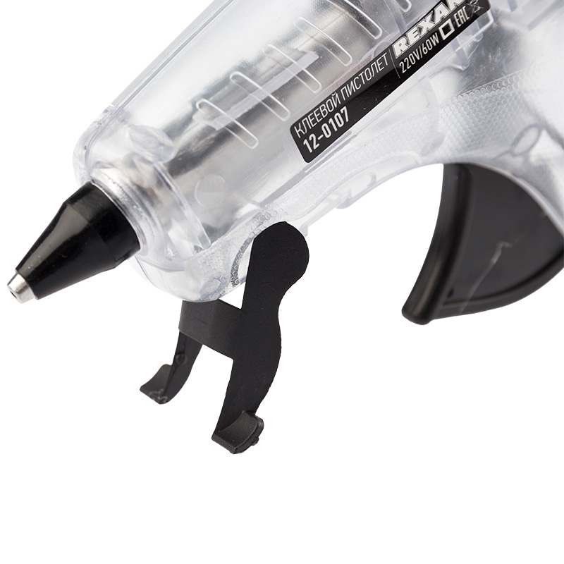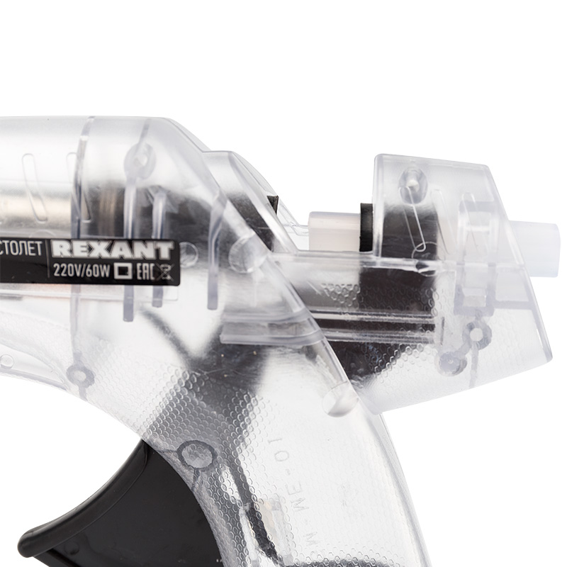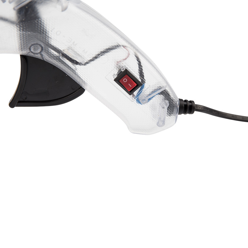 Корпус пистолета изготовлен из ударопрочной пластмассы, поэтому инструмент служит дольше, а специальная скоба позволяет устанавливать пистолет в режиме ожидания. Прозрачный корпус позволяет визуально оценивать состояние внутренних компонентов пистолета, а также контролировать количество клея. Сопло пистолета защищено клапаном от произвольного вытекания клея и оснащено термостойким силиконовым протектором, минимизирующим риск ожогов при случайном контакте и защищающим рабочую зону от высокой температуры. На корпусе пистолета есть кнопка включения, благодаря которой пользователю удобнее контролировать использование пистолета. Пистолет используется с клеевыми стрежнями диаметром 11 мм.