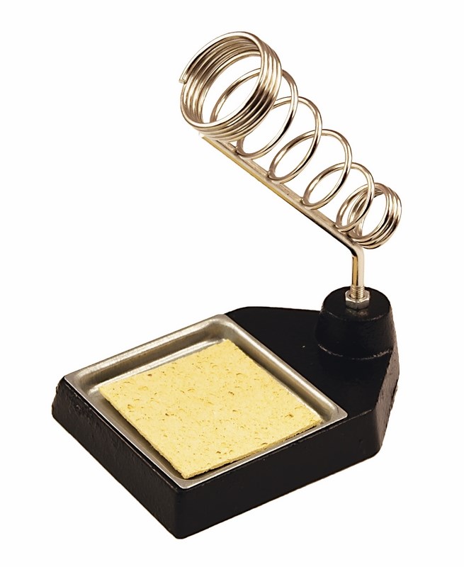 Выполнена из витой хромированной конусообразной пружины и чугунной платформы с ложементом под губку для очистки жала паяльника от остатков припоя. Губка для очистки жала паяльника в комплекте.